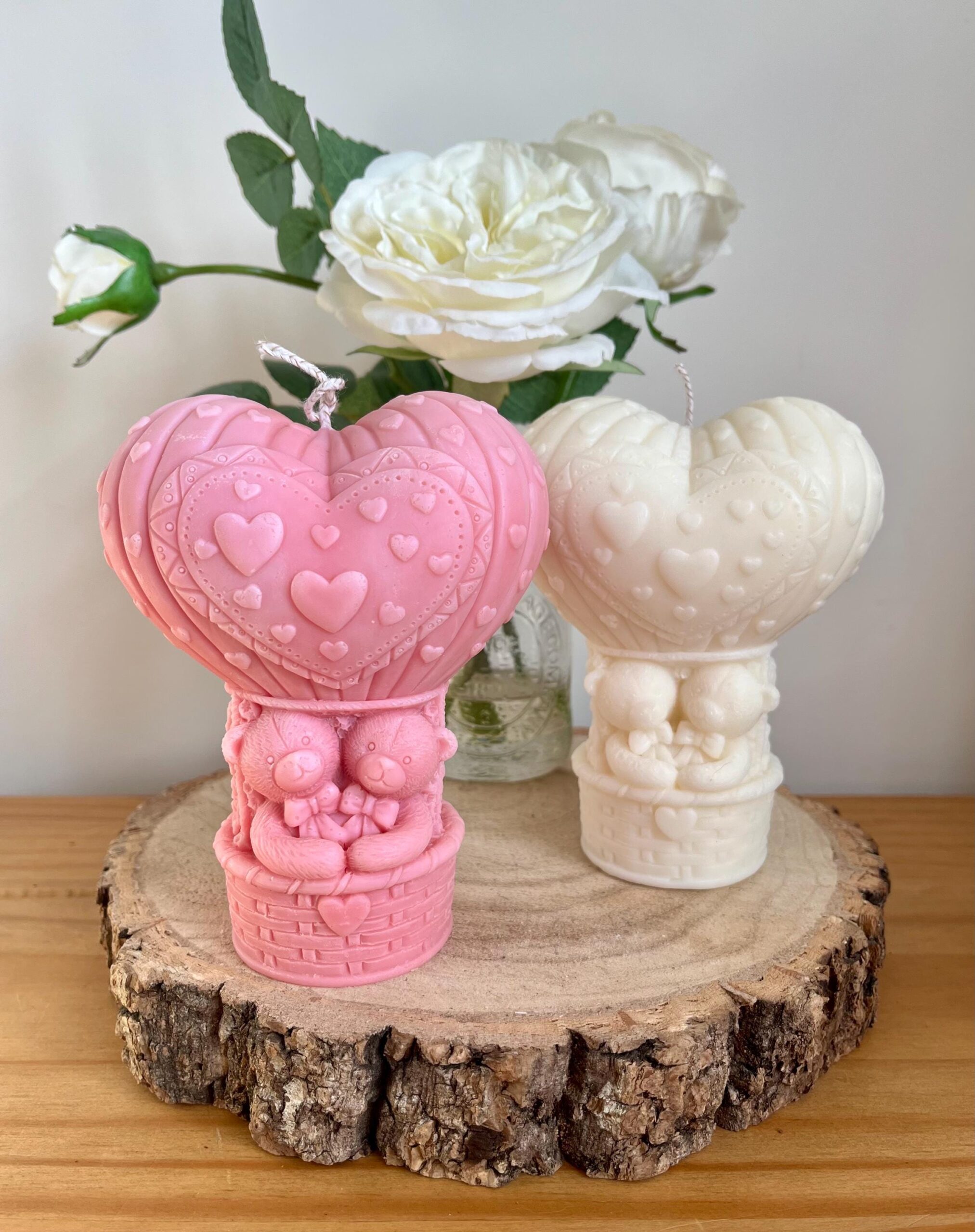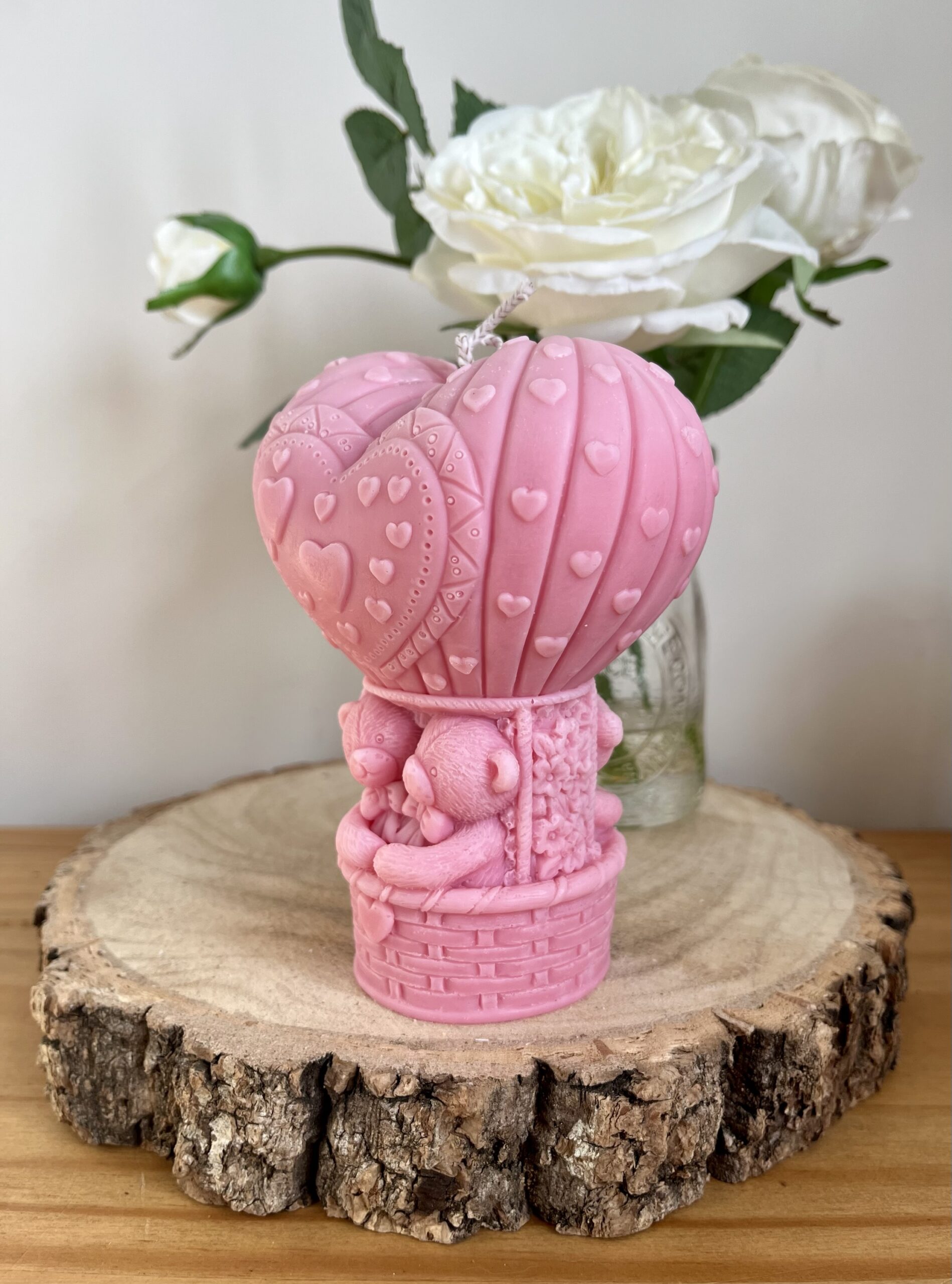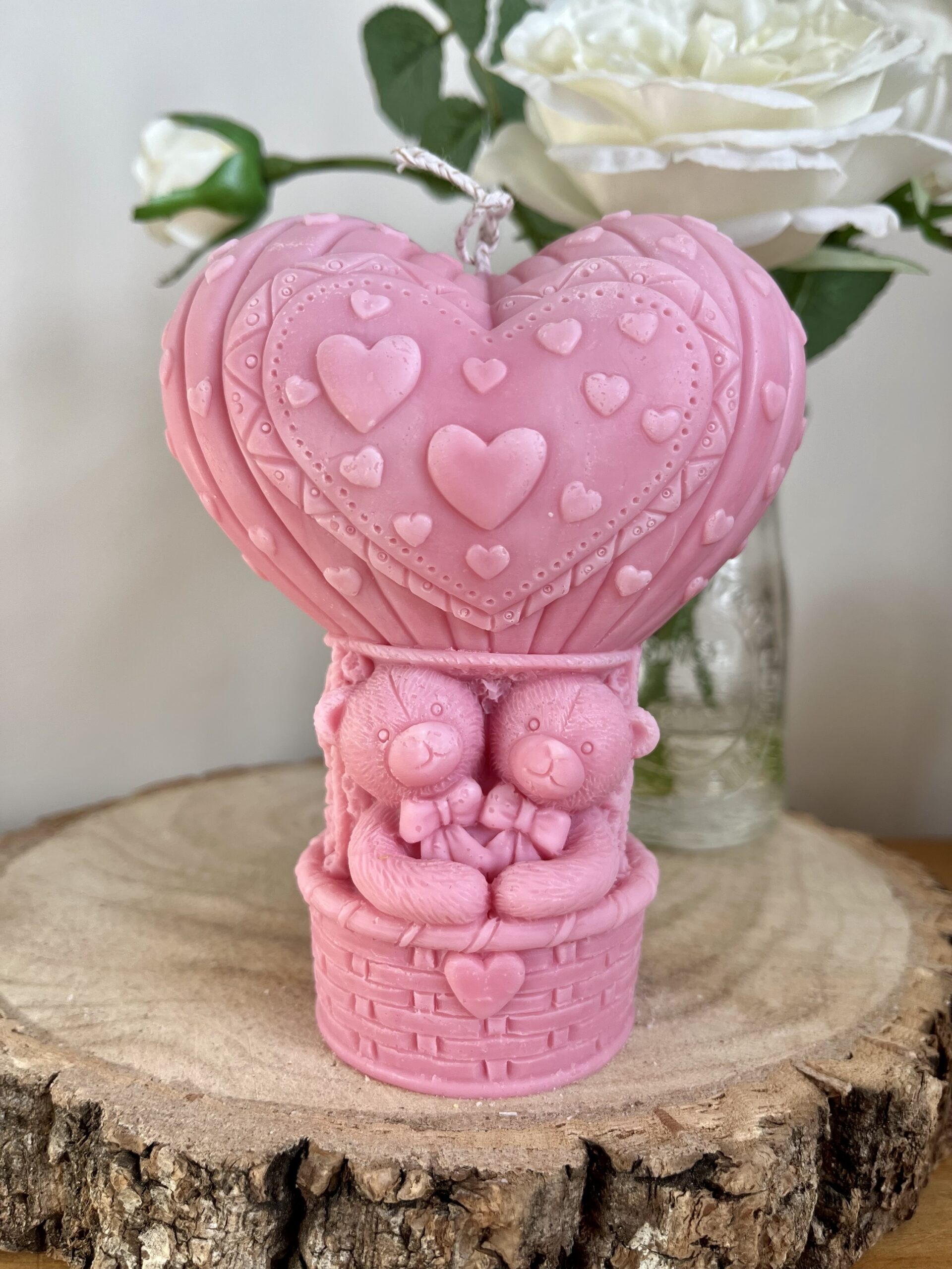 The heart-shaped balloon symbolises love, while the bear couple represents companionship and warmth. Therefore, this candle makes a meaningful keepsake as well as a charming decorative piece. In addition, the delicate floral and heart details add softness and romance from every angle.