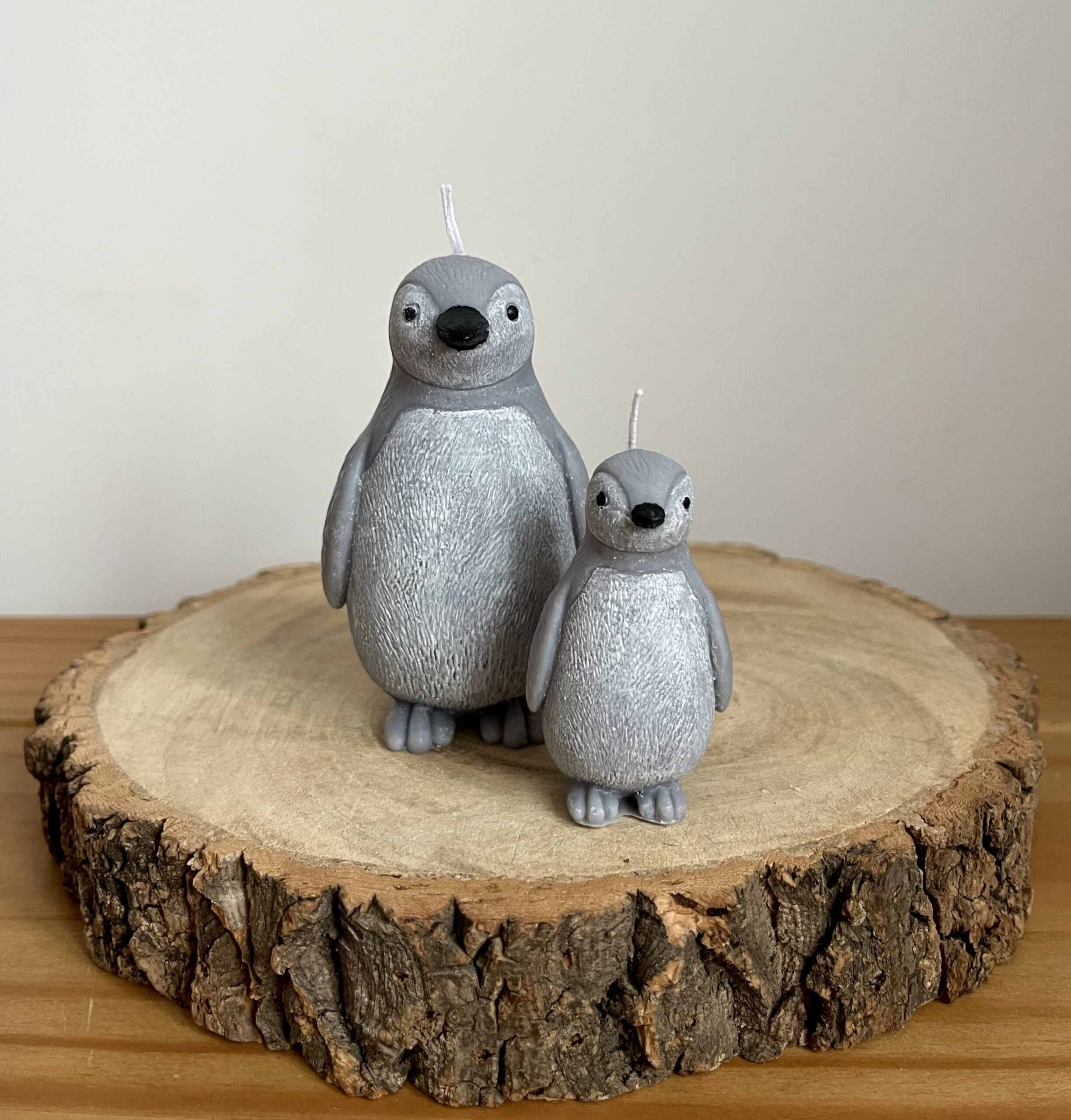The set includes a larger mum penguin candle and a smaller baby penguin candle, both finished in soft grey tones with hand-painted details. Because the candles are unscented, they are ideal for sensitive or pet-friendly homes while still providing a cosy decorative glow.