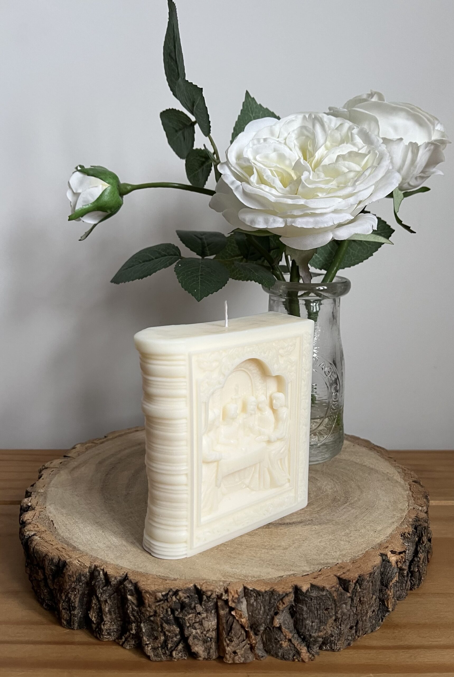 Each Last Supper candle is carefully hand-poured in the UK using 100% natural soy wax and sculpted in the shape of a Bible book. The detailed front depicts Jesus Christ and His disciples gathered together in a moment of reflection, love, and unity. As a result, this candle works beautifully as a spiritual ornament, memorial keepsake, or thoughtful religious gift.